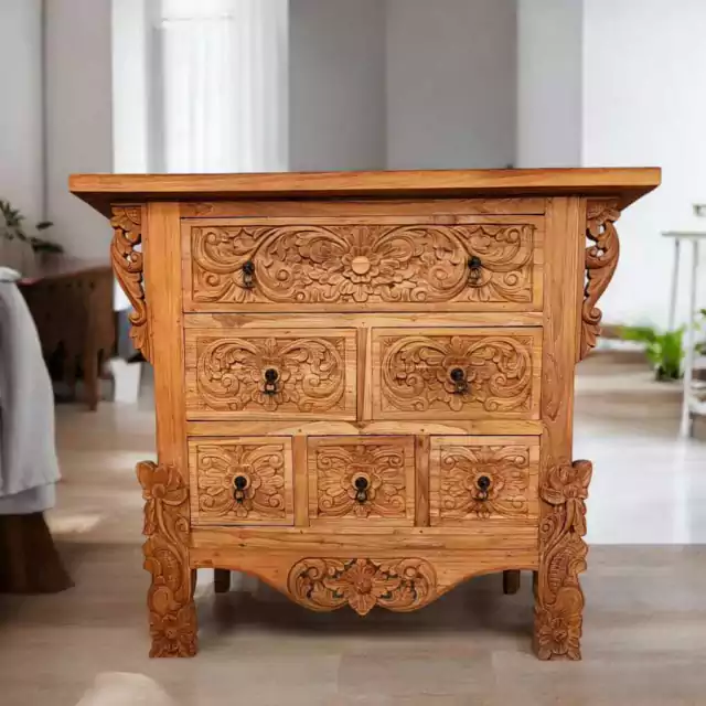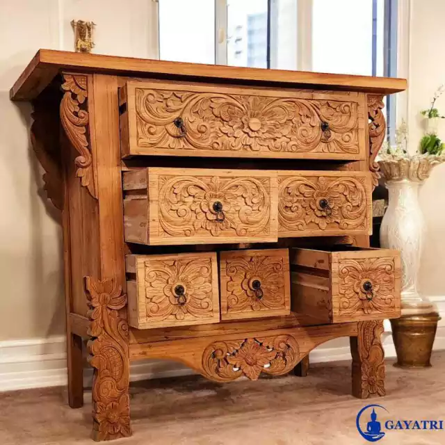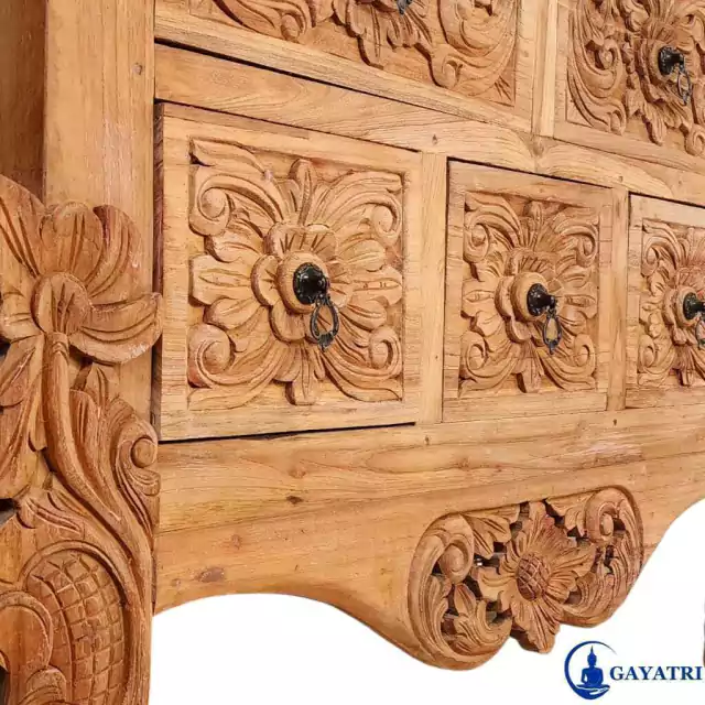 Transforme seu espaço com o nosso Buffet Armário, uma peça sofisticada e elegante, feita em madeira teca maciça com detalhes entalhados à mão.
