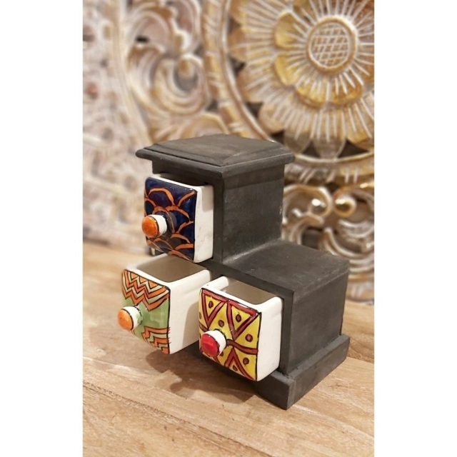 Mini Gaveteiro Indiano, produzido em madeira e com gavetas em porcelana pintada a mão. Ideal para ser usado como porta jóias, porta condimentos ou chás.